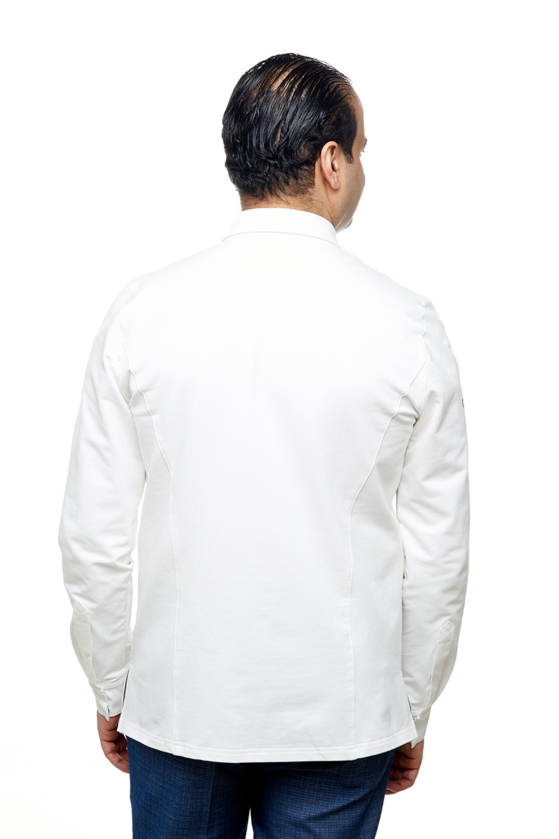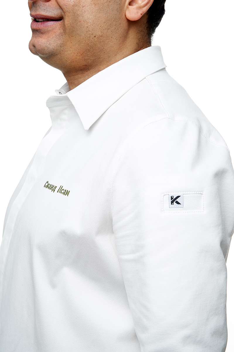 Элегантный китель-рубашка шеф-повара из комфортной фактурной хлопковой ткани с добавлением эластана. Трикотажные длинные рукава и спинка кителя очень удобные при активной работе.