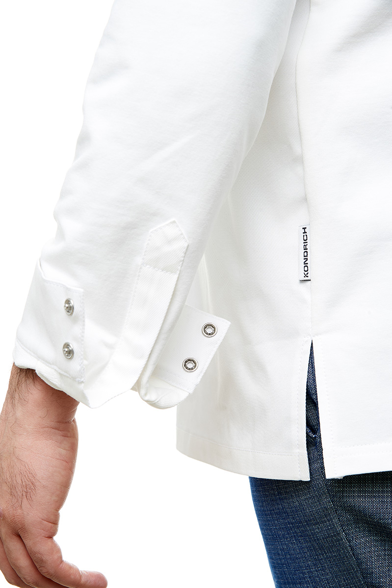 Облегающий манжет на потайной кнопке. Можно дополнить хлястик-фиксатором для фартука на воротнике. Боковые разрезы 10 см. Можно дополнить китель вышивкой логотипа и ФИО шеф-повара.